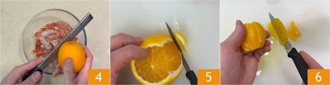 Transfer the cleaned prawns into a bowl and season with orange zest 4. With a sharp knife, peel the orange: first, remove the peel completely 5, then cut the orange segments taking care not to include the white part 7. Set the segments aside for final decoration.