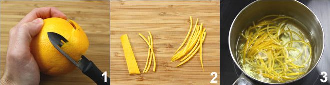 To prepare the orange risotto, start by washing the orange and peeling it with a peeler 1, being careful to remove as little of the white part as possible (which would be bitter); squeeze the orange and set the juice aside. Cut the peeled zest into rather thin strips 2 that you will briefly parboil in a pan 3 containing a couple of fingers of water and then drain.
