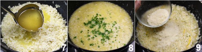 Peel and finely chop the onion, sauté it in melted butter, then add the rice 4, which you will toast for a few minutes; deglaze the rice with a splash of white wine 5 and then add the orange juice 6.
