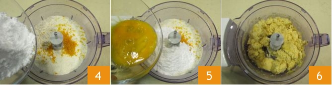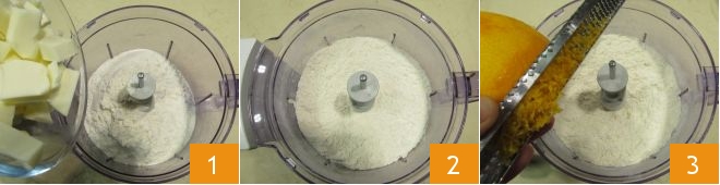 To prepare the orange tart, first, make the shortcrust pastry: place the flour and cold cubed butter in the mixer 1, blend everything in short bursts to avoid heating the dough too much, until you get a sandy mixture 2, then stop the blades and flavor it with orange zest 3,