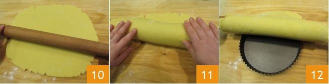 roll out the dough to a thickness of about 1/4 inch 10. Roll the rolled-out dough onto the rolling pin 11 and gently unroll it over a fluted tart pan with a diameter of 9.5 inches 12.