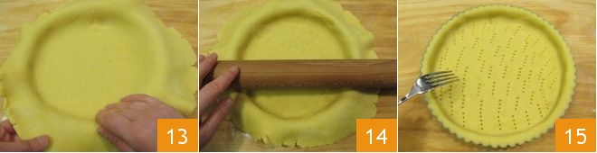 With your fingers, press the dough into the edges to make it adhere well to the pan 13. At this point, run the rolling pin over the edge of the pan to trim away excess dough evenly and neatly 14. Prick the bottom of the tart with a fork to prevent air bubbles from forming during baking 15.