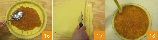 Fill the tart with marmalade, spreading it evenly with the back of a spoon 16. Take the leftover dough, roll it out to a thickness of 1/4 inch. Cut strips of dough with a fluted wheel 17. Now apply the strips of dough by intersecting them: attach 5 strips of dough to the edge of the tart starting with the first 18, spacing the others evenly.