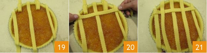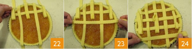 Lift again, this time the first strip, the third, and the last one 22 and lay another one horizontally 23; proceed by folding the vertical strips over the tart and continue with this technique to finish all the strips 34.