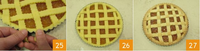 Once the entire tart is covered, press the ends firmly with your fingers on the edge 25. Once ready 26, bake the orange tart in a static oven on the lower shelf at 340°F for 50 minutes. Once baking is complete, remove the orange tart from the oven, let it cool 27 before unmolding it.