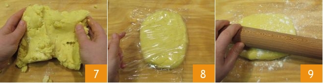 Transfer the dough to a work surface 7 and work it quickly, just enough time to compact it and form a dough ball. Wrap the dough ball with plastic wrap 8 and let it firm up in the fridge for 1 hour. After the specified time, take the dough ball, roll it out with a rolling pin on the work surface 9