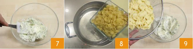 Once the cream is homogeneous 7, set it aside covered with plastic wrap and boil the orecchiette in plenty of salted water to taste 8. Drain them while still al dente (keep a glass of cooking water aside). Combine the orecchiette with the prepared seasoning 9