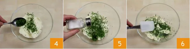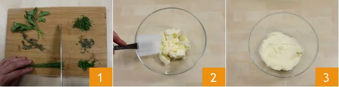 Add the finely chopped aromatic herbs to the butter 4, salt 5, and pepper to taste, then mix the ingredients 6.