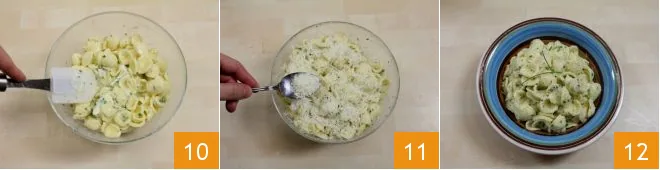 and mix everything well with a spatula 10, add the grated pecorino 11, incorporate it well, and if the pasta is too dry, add a few tablespoons of cooking water. Serve the orecchiette with aromatic herbs hot, garnishing the serving plates with a few sprigs of aromatic herbs 12.