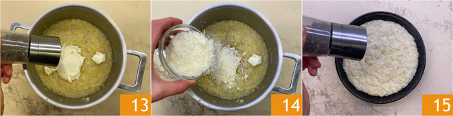 Add the pepper 13, grated Parmesan cheese 14, and stir. Plate and season with another sprinkle of pepper 15.