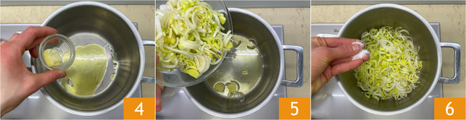 In a pot, pour the oil and add a pat of butter 4 and the leeks 5. Season with salt 6 and stew for at least 5 minutes.