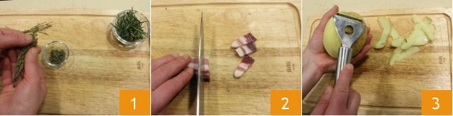 To prepare the oven-baked potato wedges with bacon, start by gathering the rosemary needles and thyme leaves 1 that will be used to flavor the dish. Take the slice of bacon and cut it into cubes 2. Separately, wash and peel the potatoes 3.