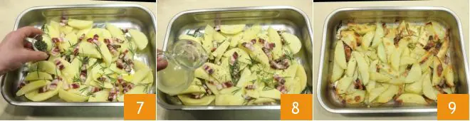 First cut them in half lengthwise and then into wedges 4. Transfer the potato wedges into a baking dish that can comfortably hold them, season with a drizzle of olive oil 5, add the diced bacon 6,