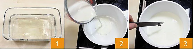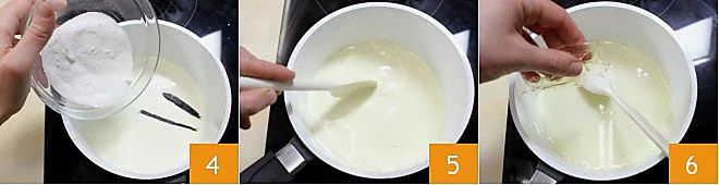 Add the sugar 4 and heat the mixture to dissolve the sugar, stirring with a spoon 5. Squeeze the gelatin and add it to the mixture 6, then stir to dissolve it and turn off the heat.
