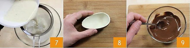 Strain the panna cotta to remove the vanilla bean 7 and let it cool, covered with cling film. Meanwhile, gently open the eggs in half 8: for this recipe, we used eggs with a white chocolate interior, but you can use entirely milk or dark chocolate eggs. To reinforce the eggs (especially if they are milk chocolate) that might melt when we pour in the panna cotta, and to create a contrast with the panna cotta, melt the dark chocolate in a bain-marie or microwave 9 and