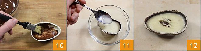 brush the inside of the eggs with it 10, then place them immediately in the freezer for a couple of minutes. Take the now cold eggs and fill them one at a time, placed in a small bowl in case they melt at the bottom, with the panna cotta 11. Place the filled eggs in the freezer for 10-15 minutes, and when they have cooled down, let them thicken in the refrigerator for at least 3 hours. Once set, garnish with chocolate shavings 12 your panna cotta filled eggs!