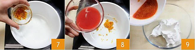 Now, place another pan on the stove with the sugar, the grated zest of half an orange 7, and the orange juice 8: dissolve the sugar, and when ready, remove from heat, let it cool, and gradually add it to the meringue 9.