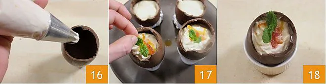 After this time, transfer the mixture into a pastry bag and fill the chocolate eggs 16, breaking only the upper part as in the tiramisu filled eggs recipe. Decorate the eggs with some orange pieces and a mint leaf 17, and here are your orange mousse filled eggs 18.