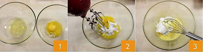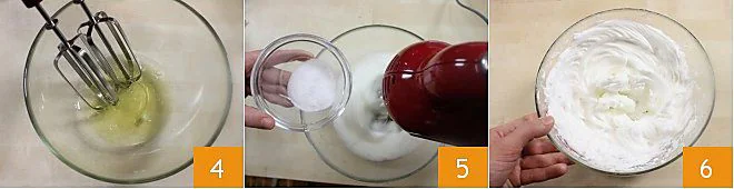 Separately, beat the egg whites 4, and when they are semi-whipped, add the other half of the sugar 5 and continue to beat until you get a shiny and firm mixture 6.