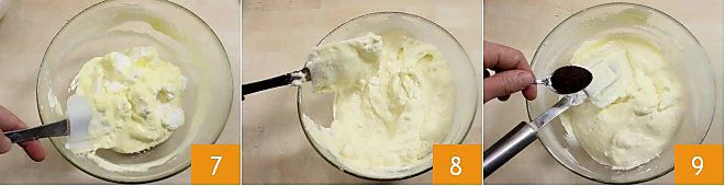 Gently fold the egg whites into the yolk and mascarpone mixture, stirring from bottom to top to achieve a homogeneous mixture (7-8), and finally add a teaspoon of coffee powder 9.