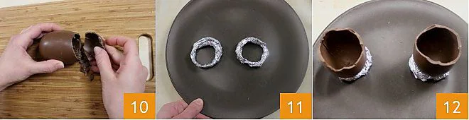Meanwhile, break only the upper part of the chocolate eggs 10. Use aluminum foil to prepare 4 supports to keep the eggs upright (or use small cocottes if you have them): fold an 8 cm long strip of aluminum foil several times on itself and then shape it into a small ring 11. Position the eggs on them to keep them upright 12.