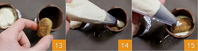 Now assemble the tiramisu: break the ladyfinger into 3 parts, soak it in cold coffee, and place it at the bottom of the egg 13. Then pipe a layer of mascarpone cream from a pastry bag 14, continue with another piece of ladyfinger soaked in coffee, and then the cream again 15.