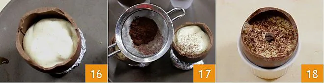 Fill all the eggs in this way 16 and finally dust the surface of the cream with cocoa powder 17 and decorate with a coffee bean placed in the center 18: here are your tiramisu filled eggs!