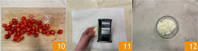 In the meantime, wash the cherry tomatoes and cut them in half 10. Also, grate the smoked scamorza 11, and set it aside 12.