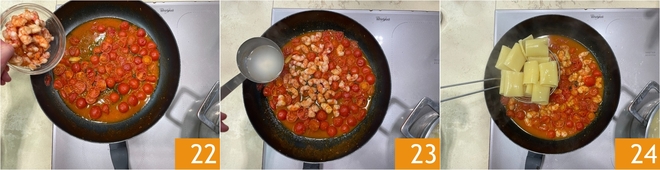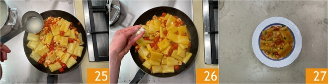 Transfer the shrimp to the pan with the cherry tomatoes 22, add a ladle of cooking water 23, and the paccheri that you have drained al dente 34.