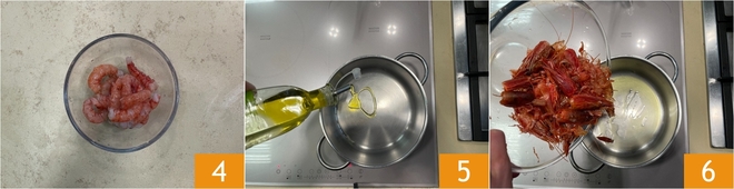In another bowl, place the cleaned shrimp 4 and store them in the fridge well covered until use. Prepare a quick bisque. In a saucepan, pour a drizzle of oil and the shrimp scraps 6.