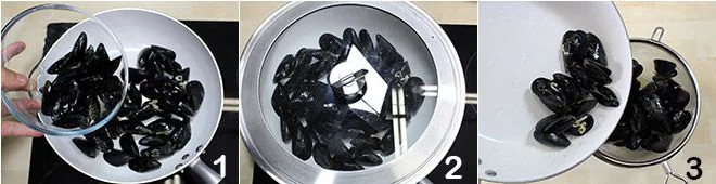 To prepare the Alghero paella, wash and clean the mussels well (you can follow the procedure indicated in the cooking guide "How to Clean and Open Mussels"), then place them in a pot 1, cover with a lid, and let them open over high heat for a few minutes 2. Once all the mussels have opened, strain the cooking liquid and set everything aside 3.
