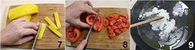 Wash the yellow bell pepper, remove the seeds and internal filaments, then cut it into strips 7. Wash and also clean the tomatoes, remove the seeds, and cut them into pieces 8. At this point, finely chop the onion and place it, along with 4-5 tablespoons of extra virgin olive oil, in the paella pan (or a non-stick skillet) with a diameter of about 12.6 inches 9.