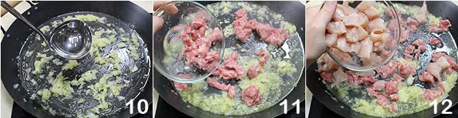 Sauté the onion over low heat, adding a ladle of chicken broth to prevent it from burning 10, then add the sausage 11 and chicken 12.