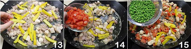 Let the meats brown for a few minutes, then add the bell pepper 13, tomatoes 14, and lastly, the shelled and drained peas 15.