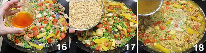 Add some broth (about a ladle) and the saffron, which you have dissolved in a small amount of broth 16, then let everything cook for a few minutes. Add the fregola, stirring 17, and the remaining broth 18 (we recommend keeping a couple of ladles aside to add if the paella becomes too dry);