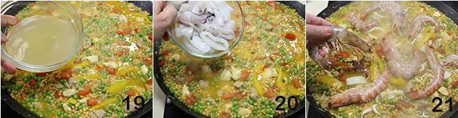 cover everything with the mussel cooking liquid, which you had set aside. Let the paella cook over medium heat for about 20 minutes (the cooking time for fregola can vary: check what is written on the fregola package you have). After 10 minutes, during which you should have checked the fregola frequently and added broth if necessary, add the squid 20 and, after 5 minutes, also the prawns 21.