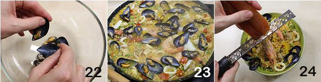 Now just add the last element: the mussels. Remove one of the two shells, the one without the mollusk 22, then, towards the end of cooking, add the mussels to the paella 23 (about 3 minutes before turning off the heat). Once the Alghero paella is ready, pepper to taste and plate. Finally, grate plenty of mullet bottarga into thin slices on each plate 34 and, if you like, drizzle with a little extra virgin olive oil.