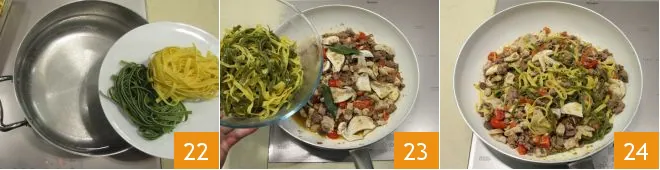 When the water has reached a boil, cook the straw and hay tagliatelle for the time indicated on the package, leaving them al dente 22; once ready, drain them, reserving a little cooking water, and sauté them for a few seconds in the pan with the meat and vegetable dressing 23. Use a spatula to gently mix to blend the ingredients well and to flavor them. Serve the straw and hay tagliatelle with mixed meat and mushrooms hot 34.