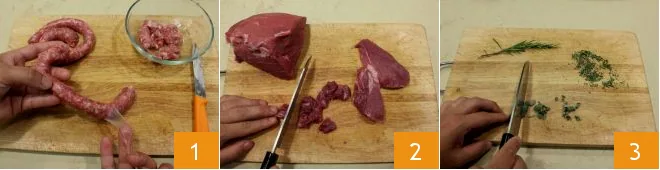 To prepare the straw and hay tagliatelle with mixed meats and mushrooms, start by scoring the sausage, then remove the casing and gently take it off with your hands. Crumble the sausage 1 and then cut the pork 2, beef, chicken, and turkey into small cubes. Finely chop the sage and rosemary leaves with a knife 3, then cut the chili pepper and remove the seeds.