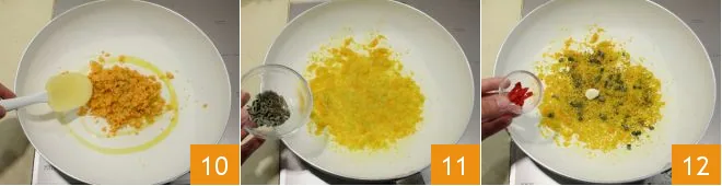 In a non-stick pot, pour a drizzle of olive oil and cook the chopped vegetables obtained for about 5 minutes 10, stirring with a spatula; then add the finely chopped aromatic herbs 11, the garlic clove, and the chili pepper 12.
