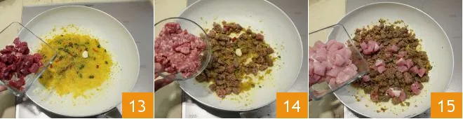 Subsequently, add the meats you had previously cut into cubes: the pork 13, the beef, the crumbled sausage 14, and the chicken 15;
