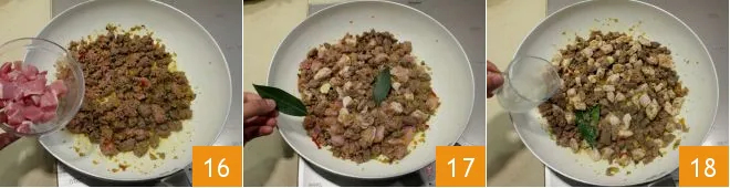 also add the turkey 16 and brown everything for at least 10-15 minutes. Add two bay leaves 17 and then pour the white wine over the meat, letting it evaporate 18.