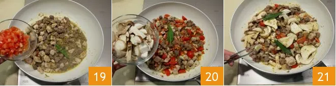 When the wine has evaporated, add the diced cherry tomatoes you had prepared to the meat ragù 19 and season with salt and pepper to your liking. In the meantime, bring a pot of abundant salted water to a boil, which will be used to cook the pasta, while you finish by adding the mushrooms to the rest of the ingredients 20 and let everything cook for another 10-15 minutes over high heat, adding (if necessary) some pasta cooking water. Once the mixed meats and mushrooms sauce is ready, turn off the heat, making sure to leave a bit of sauce at the bottom of the pan; then use kitchen tongs to remove the garlic clove 21.