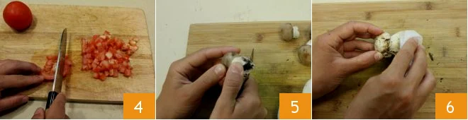 Take all the cherry tomatoes and wash them well under fresh running water; then cut them into cubes 4. Once cut, set them aside and proceed with How to Clean Porcini Mushrooms: with a smooth-bladed knife, start removing the earthy part on the stem, scraping it gently until any trace of soil is eliminated 5. If the mushrooms are quite clean, remove the few soil residues with a brush or a cotton cloth 6 (if instead they are still very dirty, pass them quickly under a stream of cold running water).