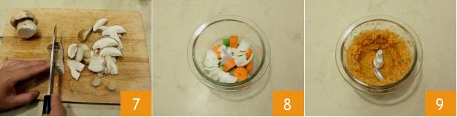 Once cleaned, cut the whole mushrooms lengthwise 7 and set aside. With a knife, cut the celery, carrot, and onion into slices 8, place everything in a blender, and chop them 9. Now that you have everything ready, devote yourself to the ragù.