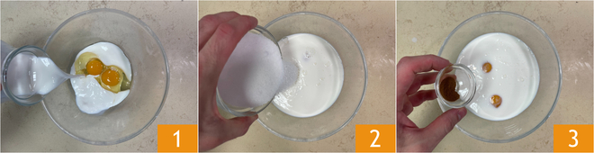 To prepare the pain perdu, first crack the eggs into a bowl, then add the soy milk 1, the sugar 2, and the cinnamon 3.