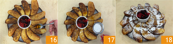 For serving, pour the berry sauce into a small bowl, place it in the center of the serving plate, then arrange the slices of brioche bread in a circular pattern. Complete with maple syrup 16 and powdered sugar 17. Your pain perdu is ready to be served 18.