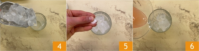 Add plenty of ice to the highball glass 4, then to give that typical savory note, add a pinch of salt 5. Now pour the grapefruit soda into the glass 6.