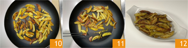 After this time, remove the lid, raise the heat, and cook for another 10 minutes or so to give them color, frequently moving the pan 10. When the potatoes are beautifully golden, remove the garlic 11 and rosemary. Serve your hot pan-fried potatoes 12!