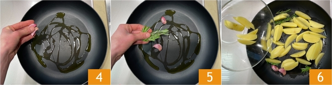 In a non-stick pan, flavor a drizzle of oil with the garlic cloves in their skins 4 and rosemary 5. After a couple of minutes, add the potatoes 6.